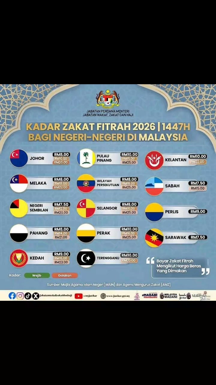 Kadar Zakat Fitrah Negeri Melaka Pada Tahun Ini